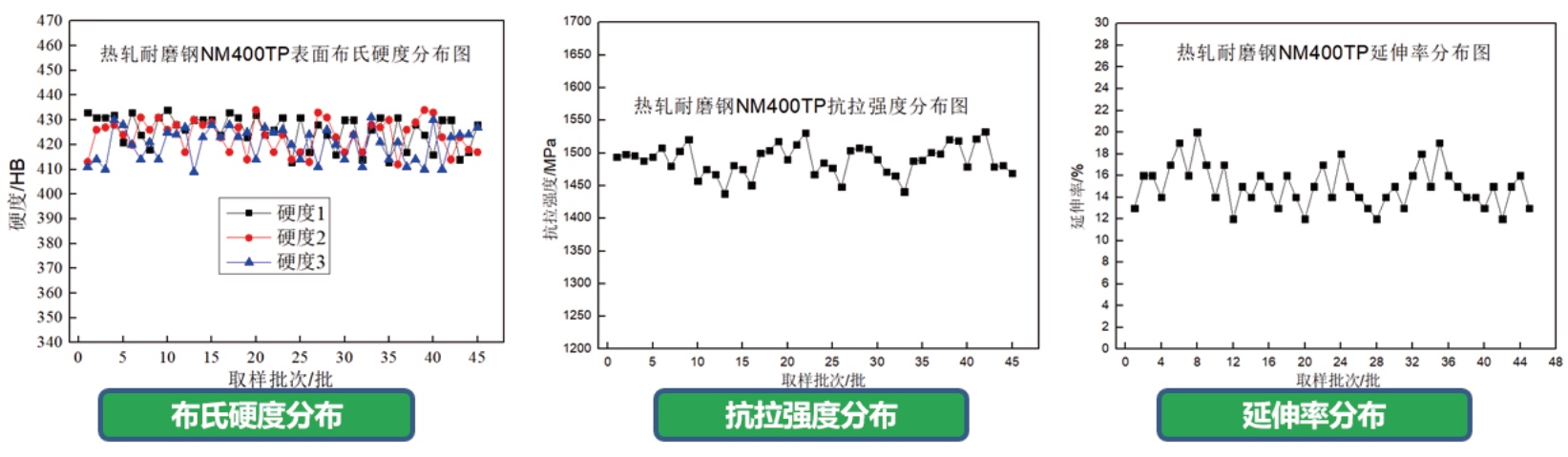 NM400TP性能分布情況(45個(gè)批次):布氏硬度高度均勻,波動(dòng)<±15HBW,均勻磨損,保證使用壽命。抗拉強(qiáng)度≥1400MPa,延伸率>11%,保證馬氏體超高強(qiáng)耐磨鋼的加工、成型性能。